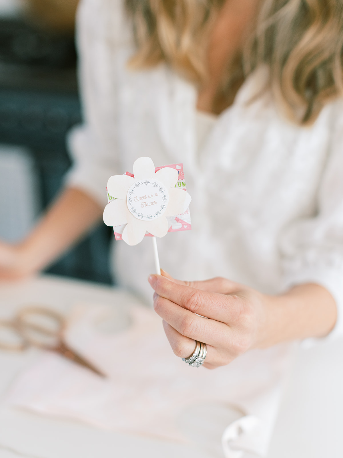 I created a flower label to glue onto the front of the lollipop. I cut out a flower-shaped piece of tissue paper for the base of the flower and used the label as the inside of the flower. Add some cute leaves to the “stem” and the kiddos will love it.