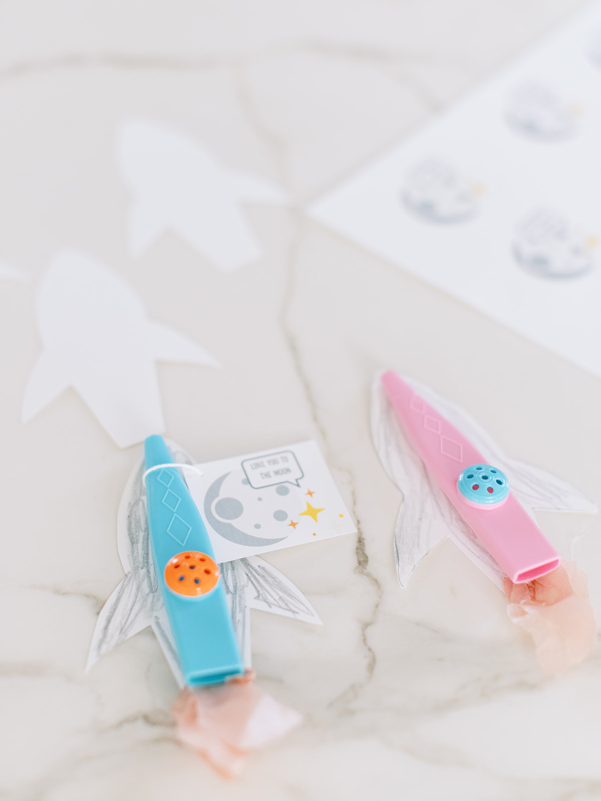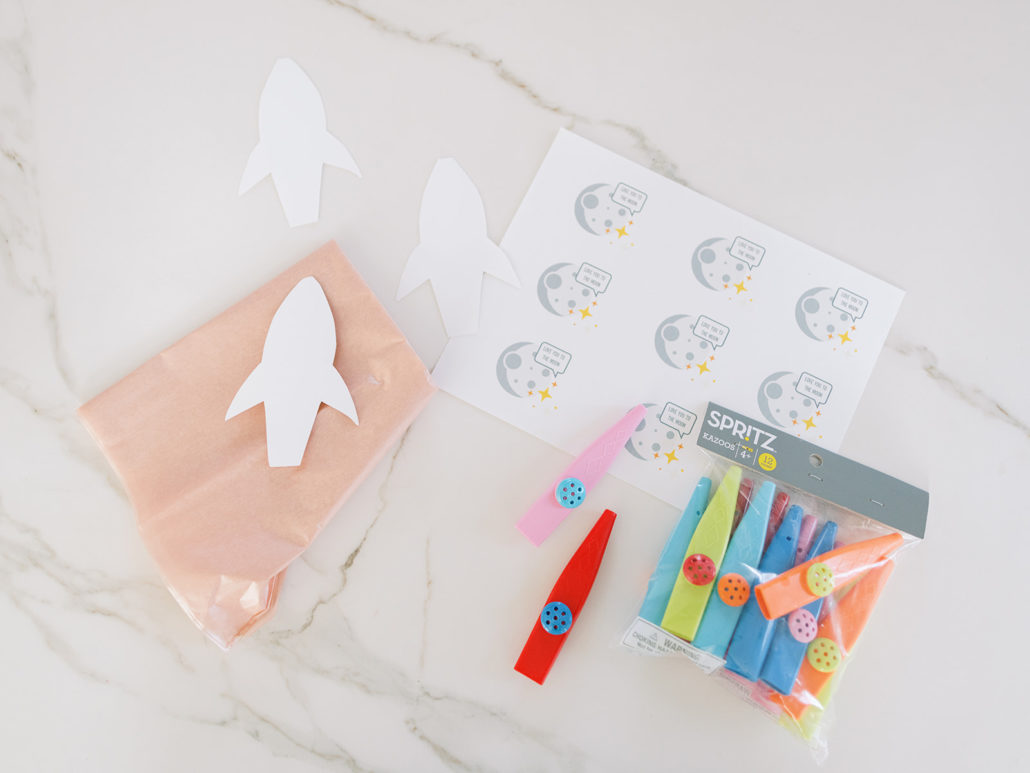 I found a party pack of Kazoos and thought, “Bingo! The perfect base of a rocket ship.” And what kid doesn’t loooove annoying their parents with that charming sound?