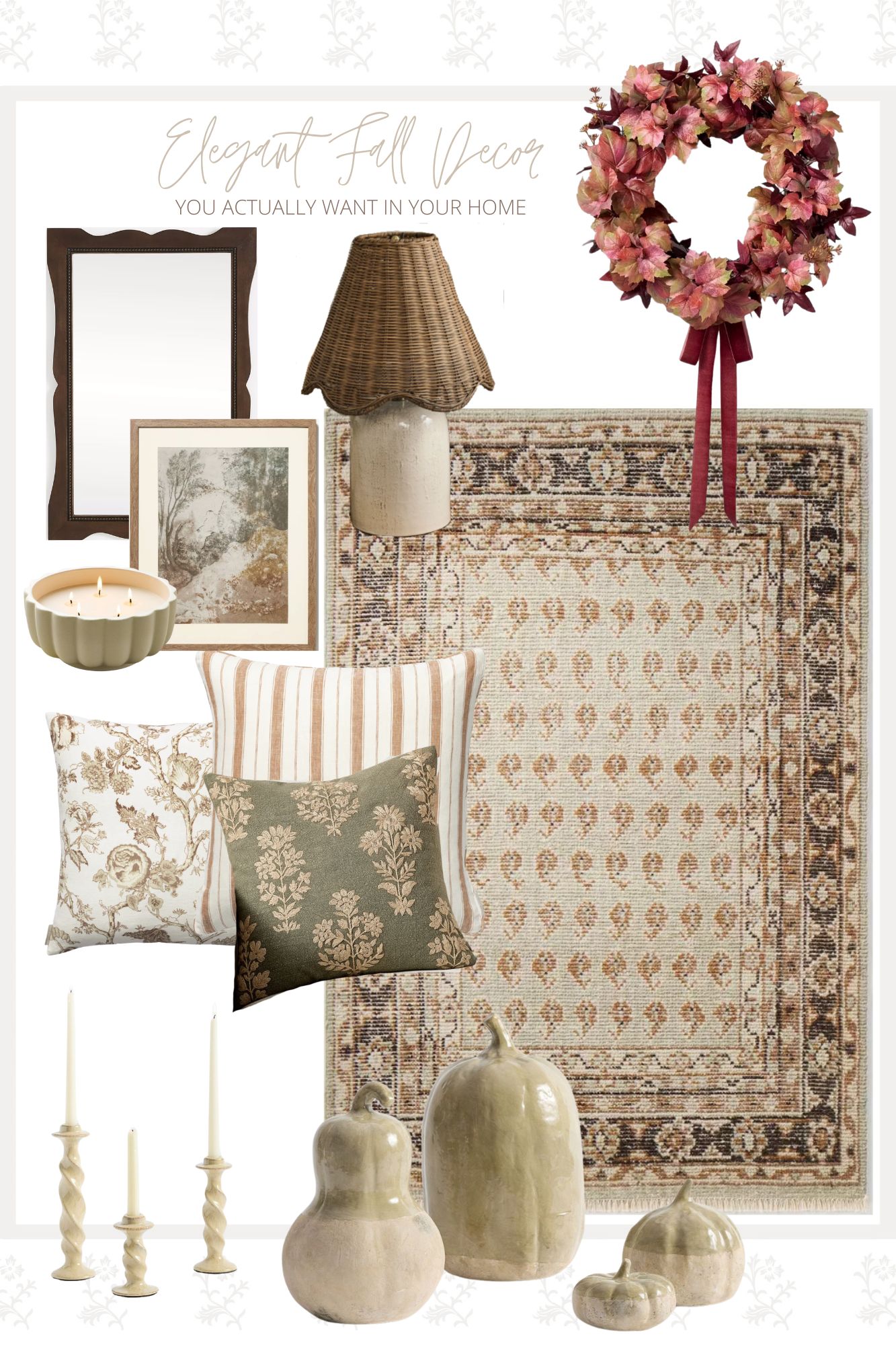 | Wood Mirror | Landscape Picture | Small Lamp | Faux Leaf Wreath | Rug | Candle | Neutral Floral Toile Pillow | Stripe Pillow | Green Block Print Pillow | Candle Stick Holders | Glazed Ceramic Pumpkins |