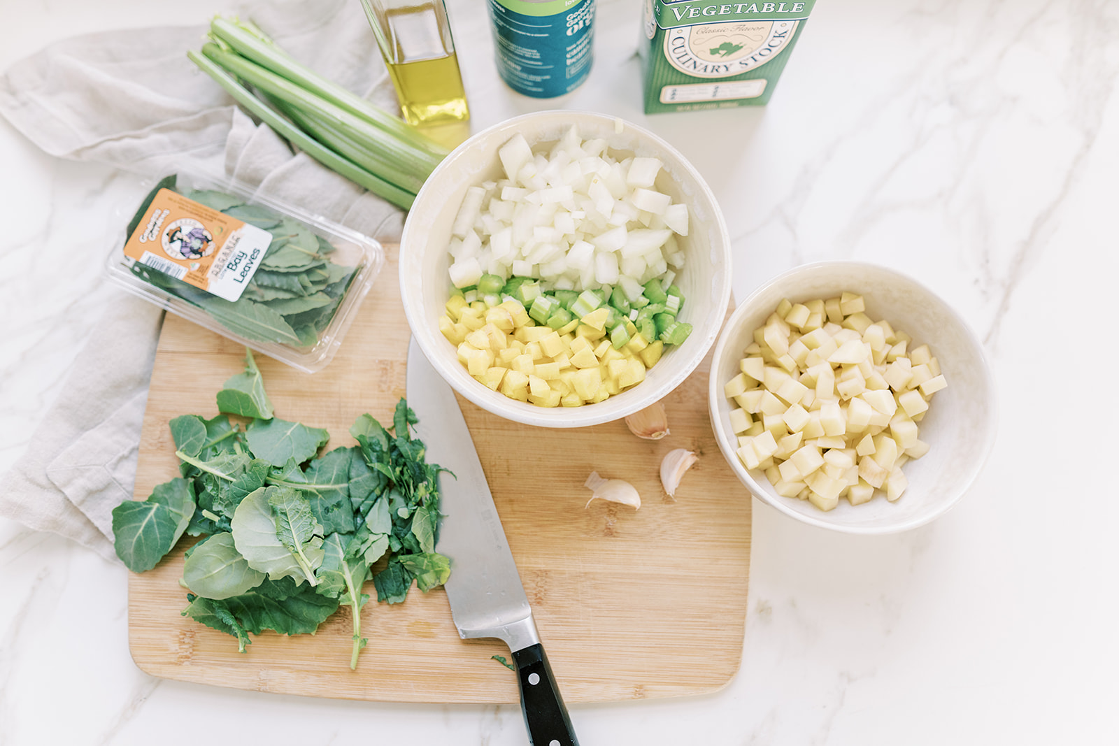 Start by prepping your ingredients–dicing your carrots, onions and celery to make your traditional mirepoix. Peel and dice several small golden potatoes to make about a cup. You want your potatoes to be the same relative size as the carrots / celery. Gather your fresh herbs.