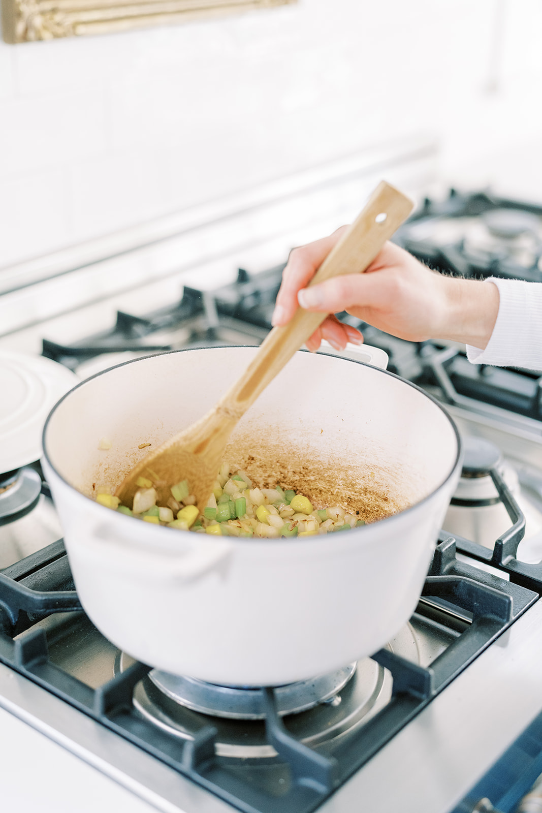 Heat olive oil in stock pan, I love my enameled cast iron dutch oven for these stovetop soups. Add celery, carrots and onions and cook on medium heat until the onions are transparent, stirring often to avoid overly browning the onions. Here I add my Tbsp of butter to the pan to help scrape the brown bits of flavor as I add my minced garlic. This is a flavor booster so don’t skip this step. You can use a plant-based butter here if you are keeping it vegetarian.