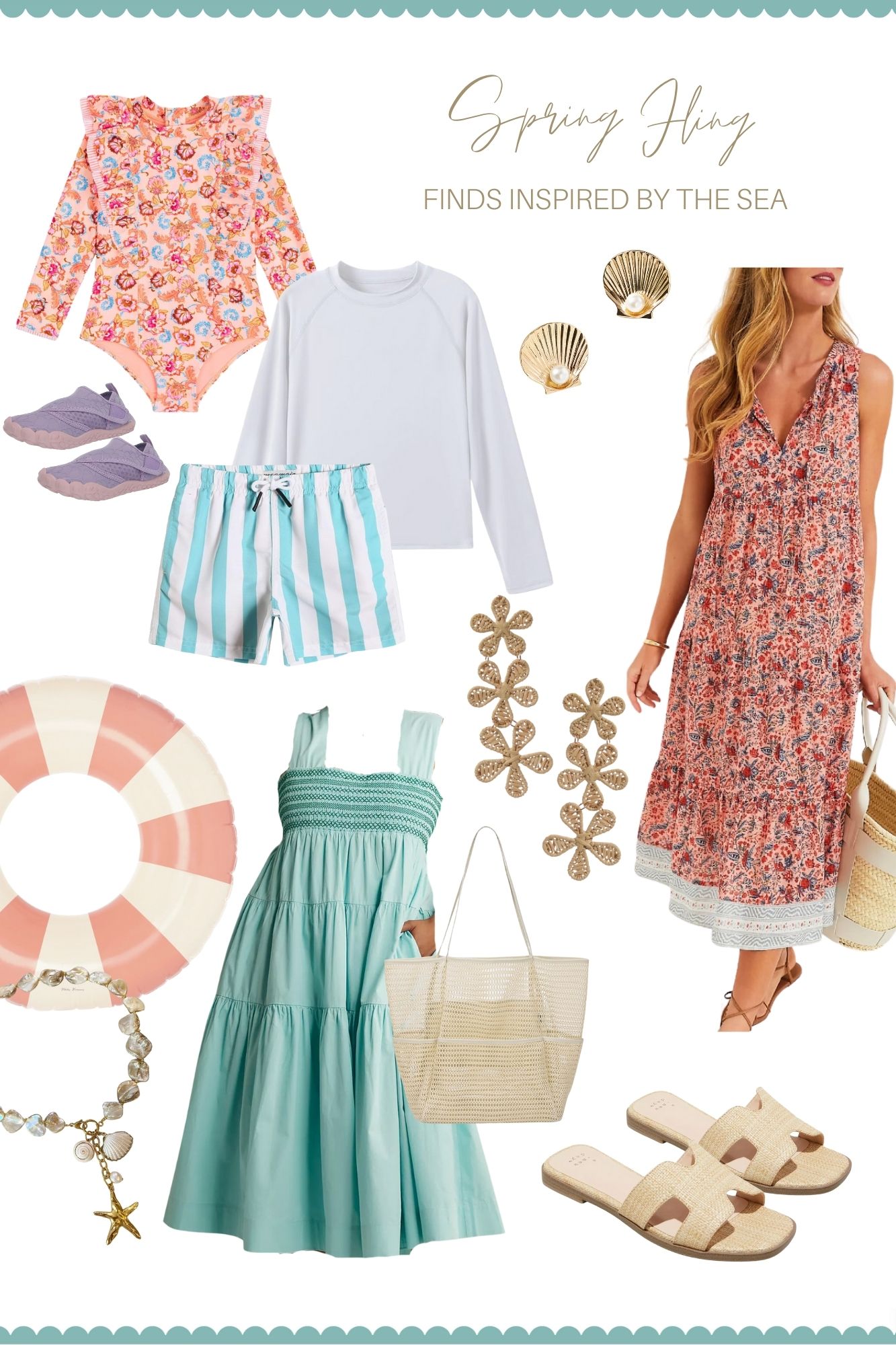 Kid’s Water Shoes | Girl’s One Piece Swimsuit | Boy’s Striped Swim Trunks | White Rash Guard | Shell Earrings | Flowy Beach Dress | Inflatable Pool Ring | Blue Dress | Beach Bag | Woven Earrings | Women’s Sandals | Shell Necklace