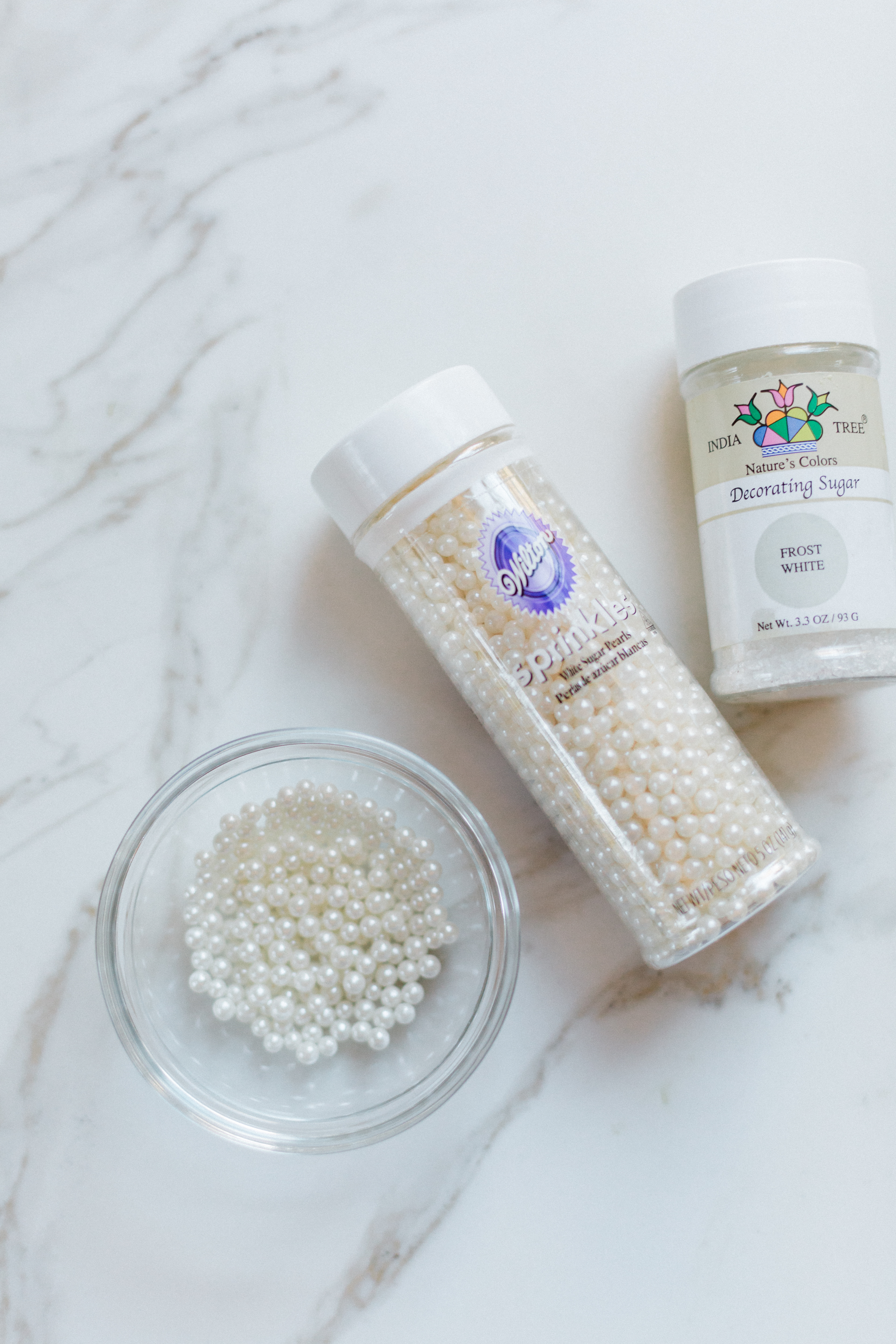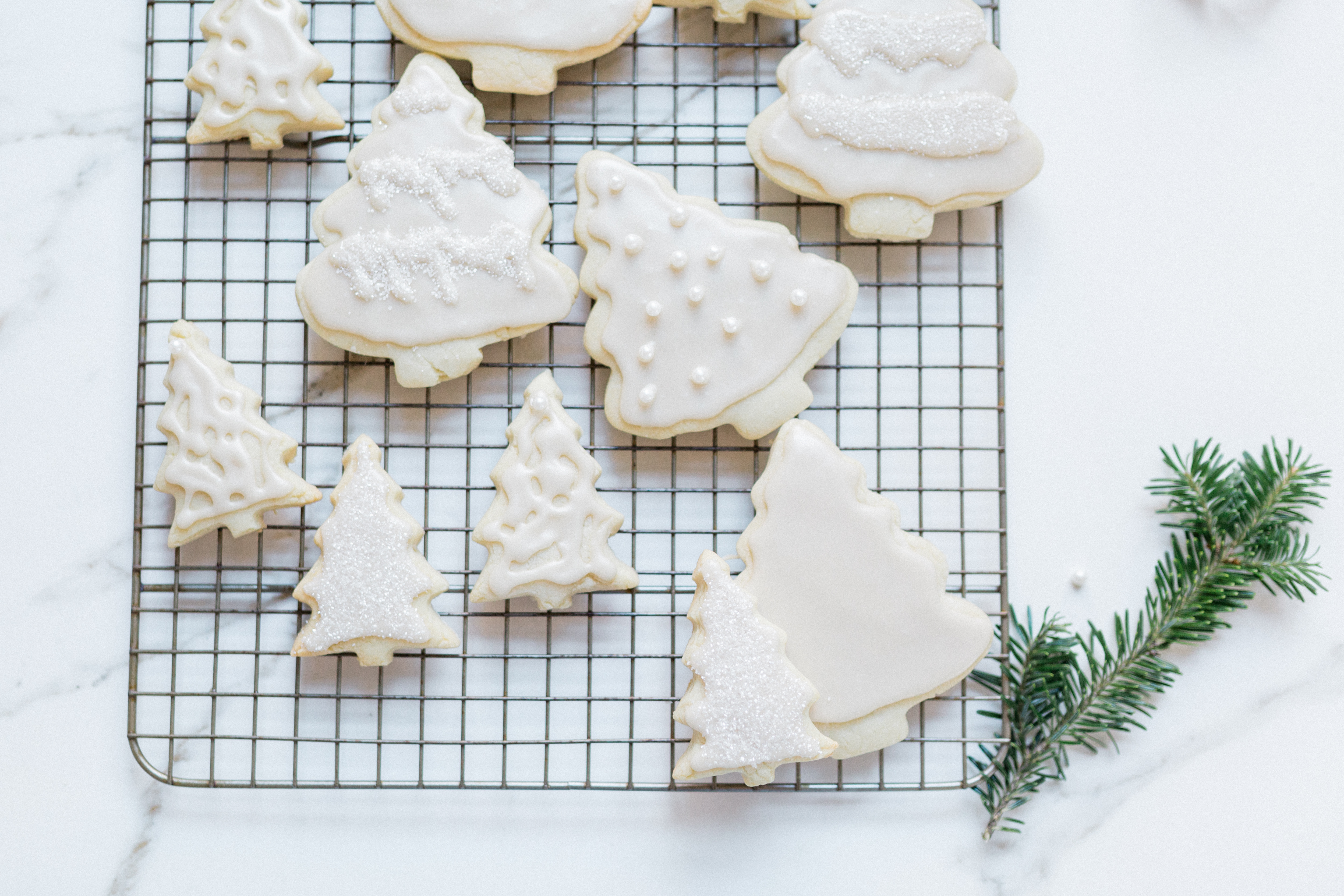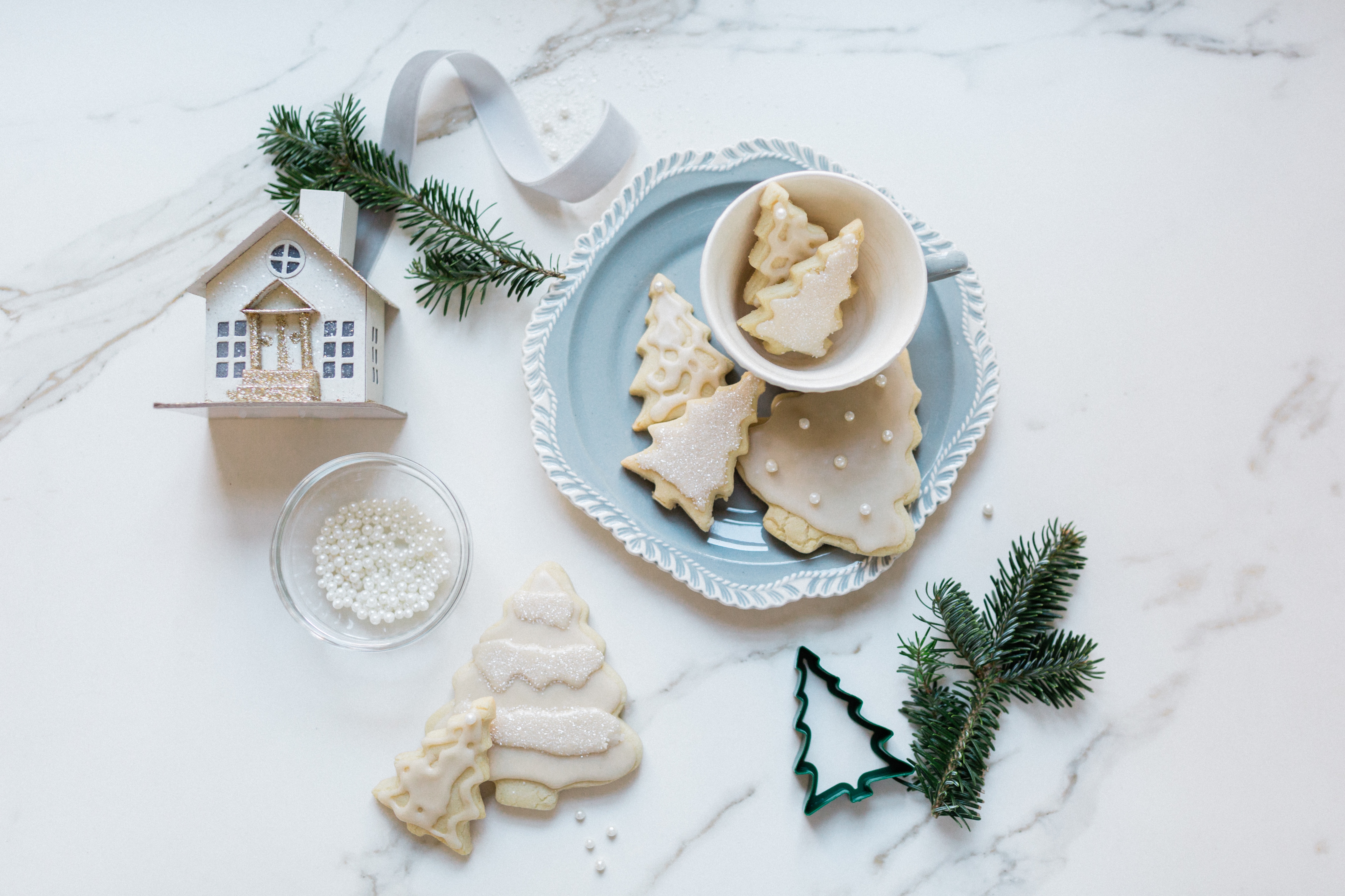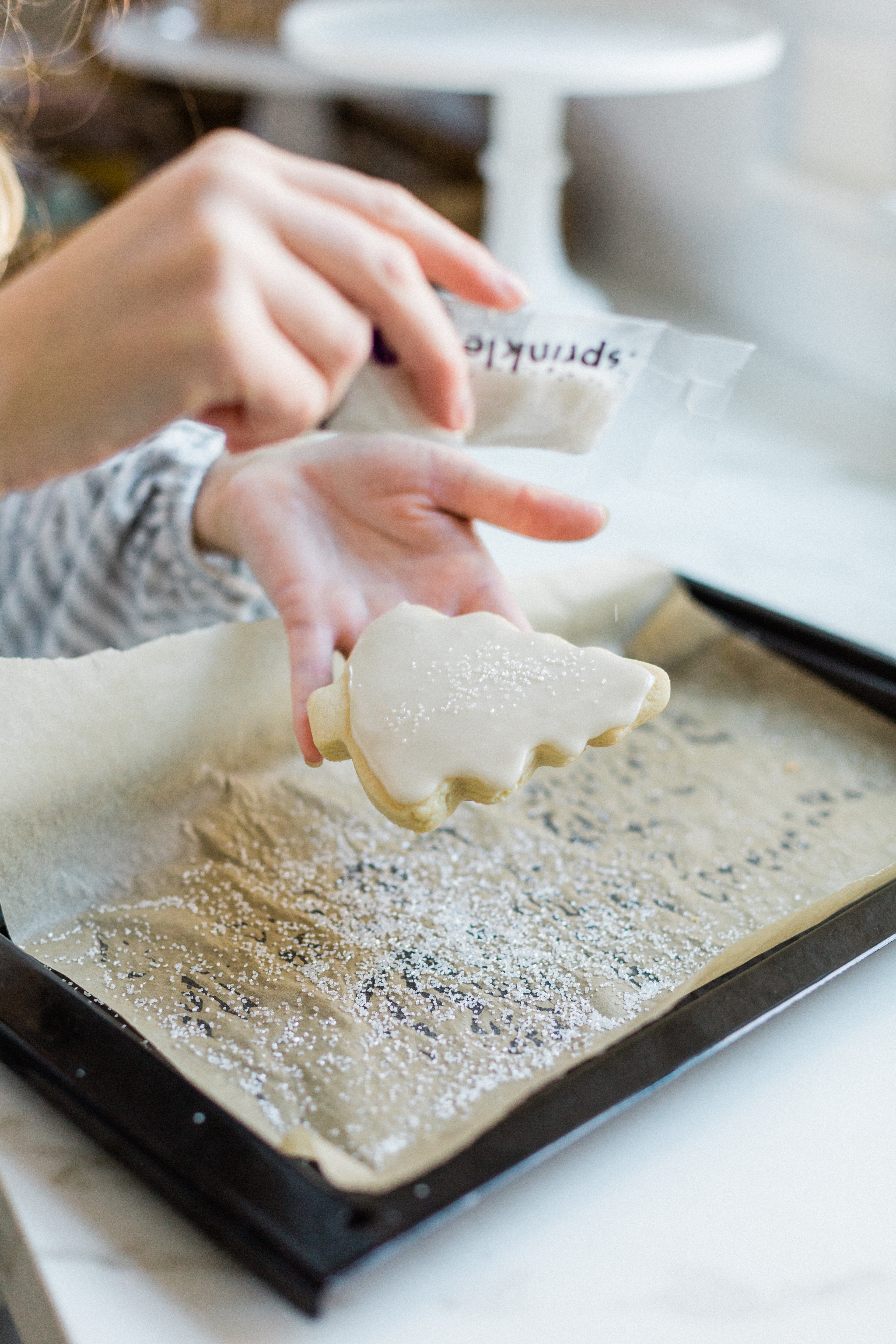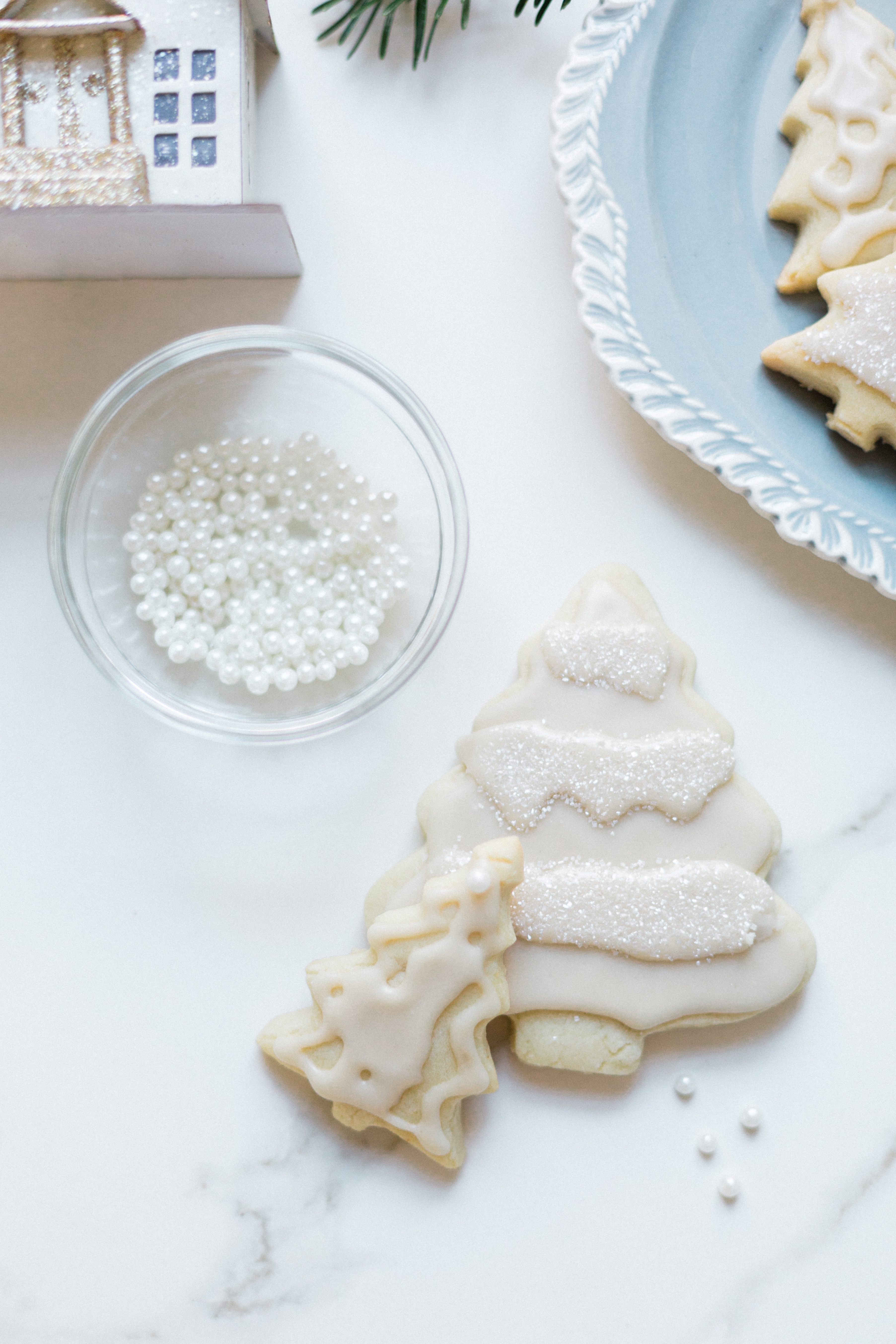 Part inspired by the German glitter houses and a neutral color palette, these sweet lovelies feel festive without feeling over the top. Some sanding sugar and sugar pearls add just the right touch of lovely. Because I used organic powdered sugar which is less white then the other powdered sugars out there and I added a bit of vanilla extract to my frosting, the frosting has an ever so slight off white color. Keep that in mind if you’re wanting pure white frosting you’ll need to adjust it a bit– regular confectioners sugar and clear vanilla extract.