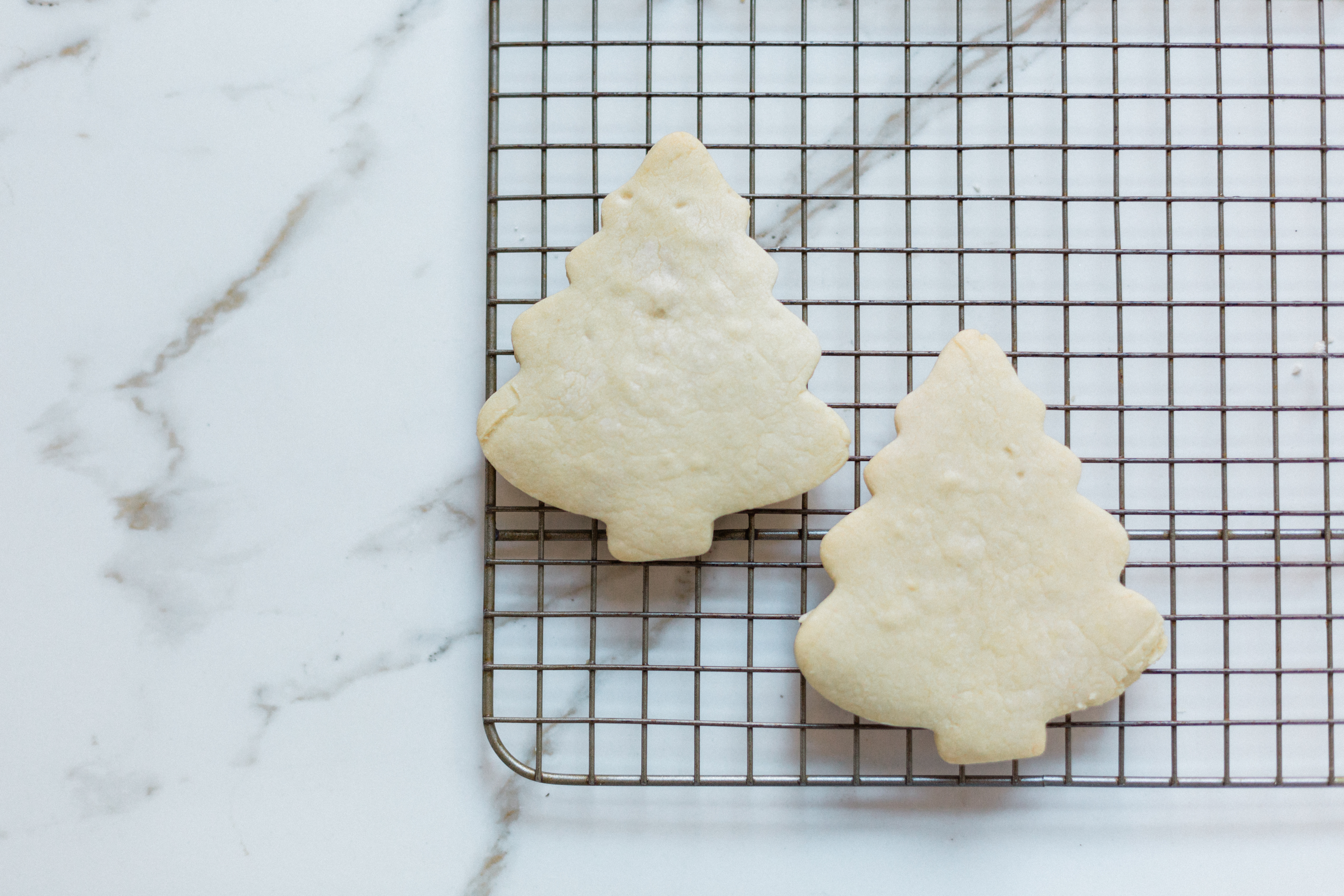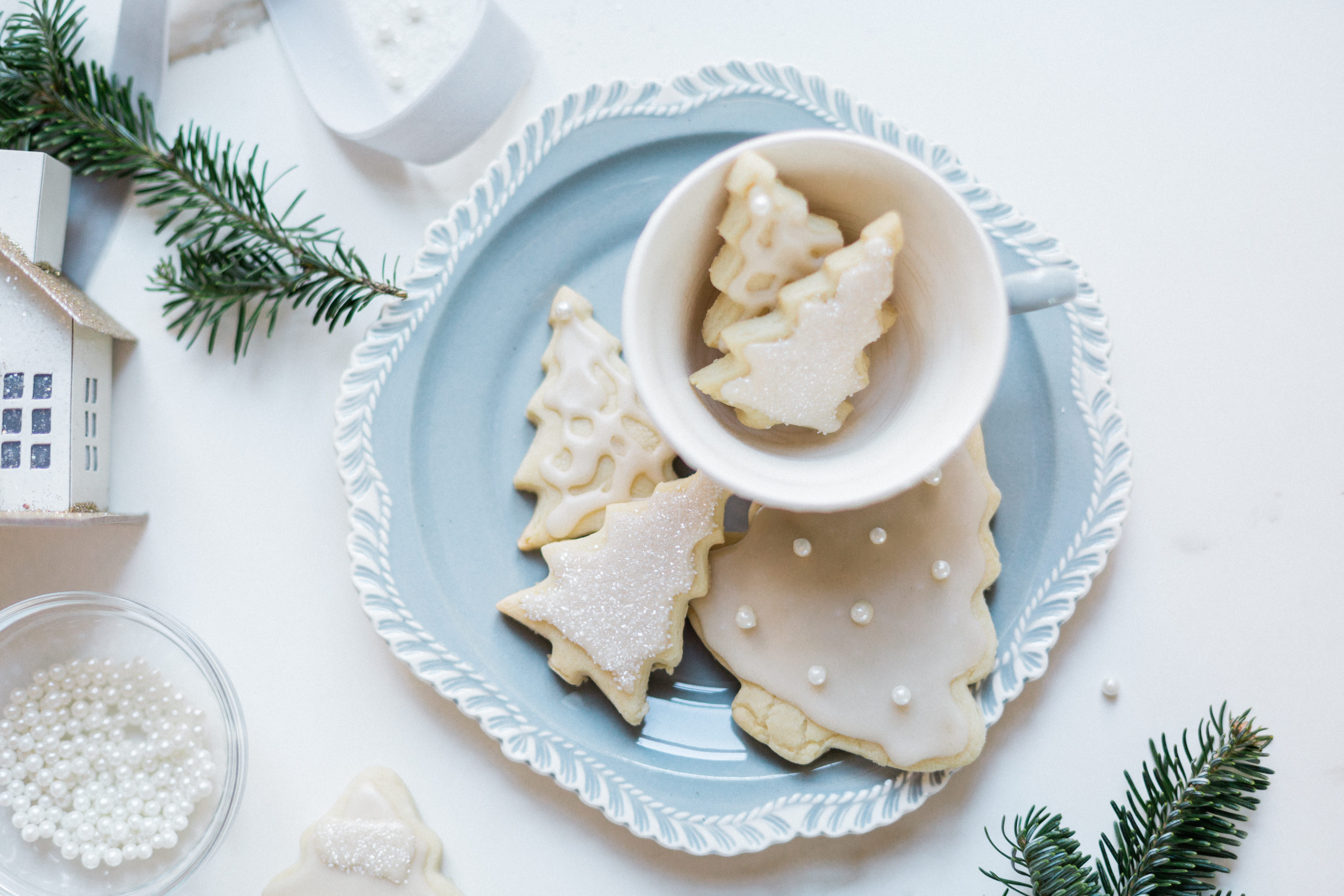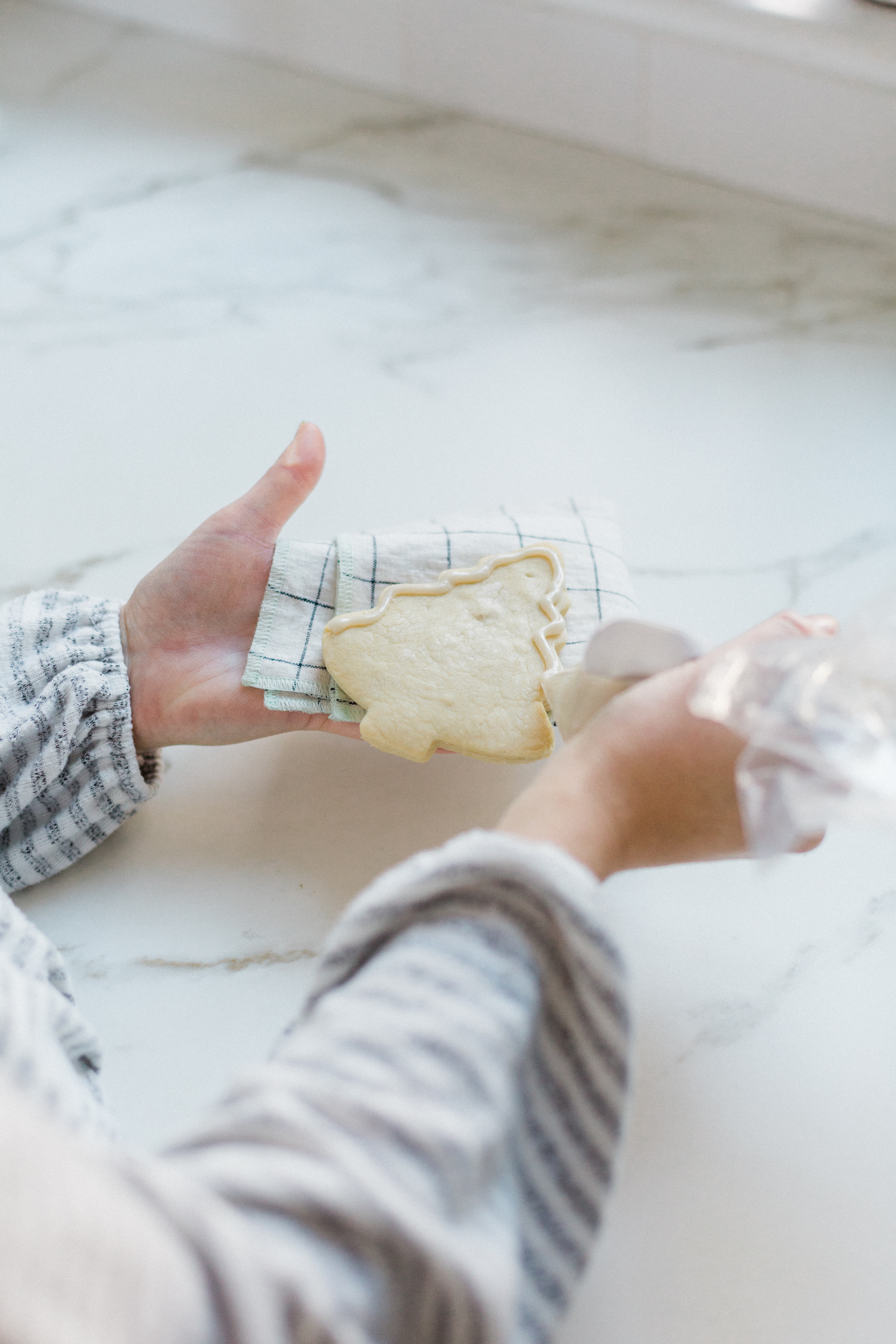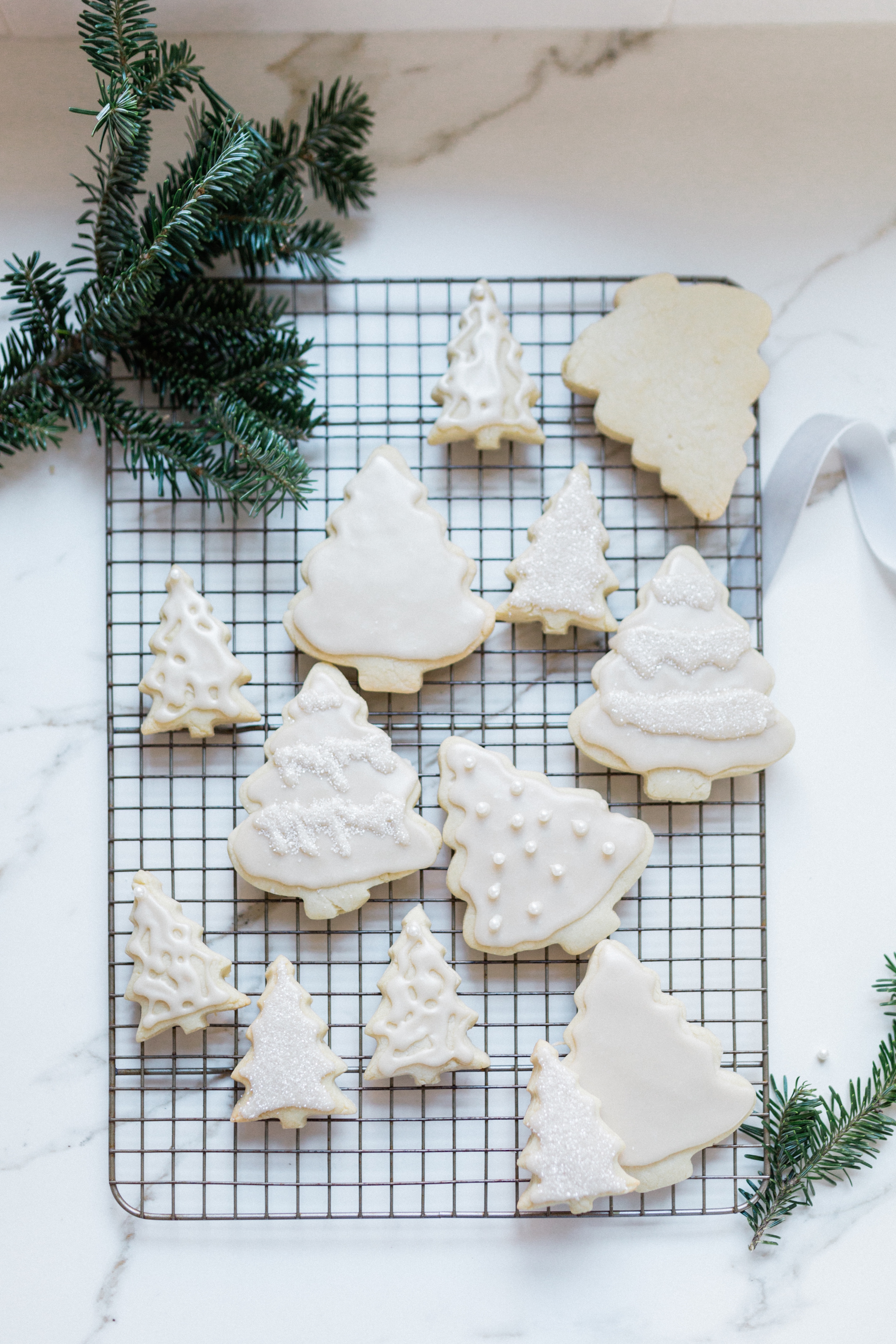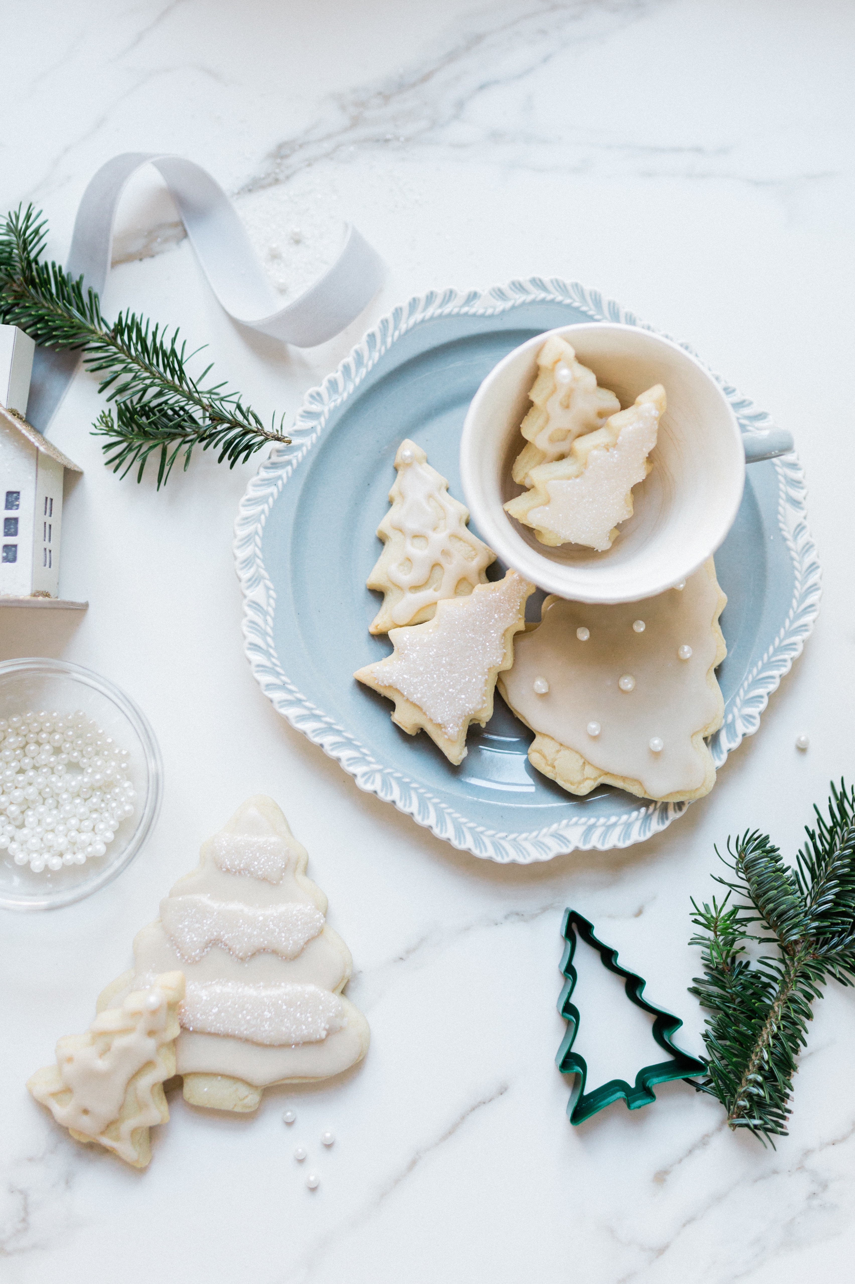 Part inspired by the German glitter houses and a neutral color palette, these sweet lovelies feel festive without feeling over the top. Some sanding sugar and sugar pearls add just the right touch of lovely. Because I used organic powdered sugar which is less white then the other powdered sugars out there and I added a bit of vanilla extract to my frosting, the frosting has an ever so slight off white color. Keep that in mind if you’re wanting pure white frosting you’ll need to adjust it a bit– regular confectioners sugar and clear vanilla extract.
