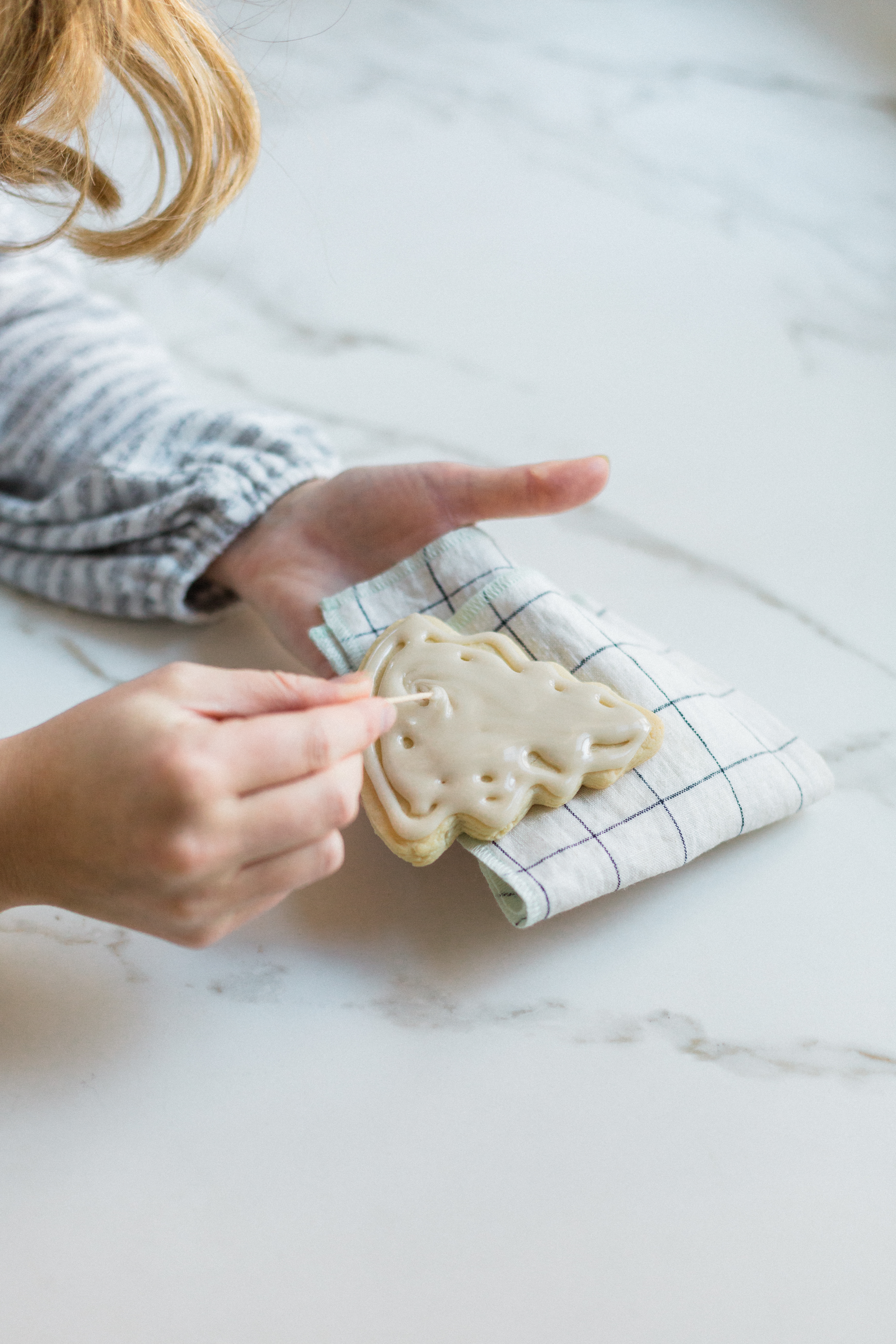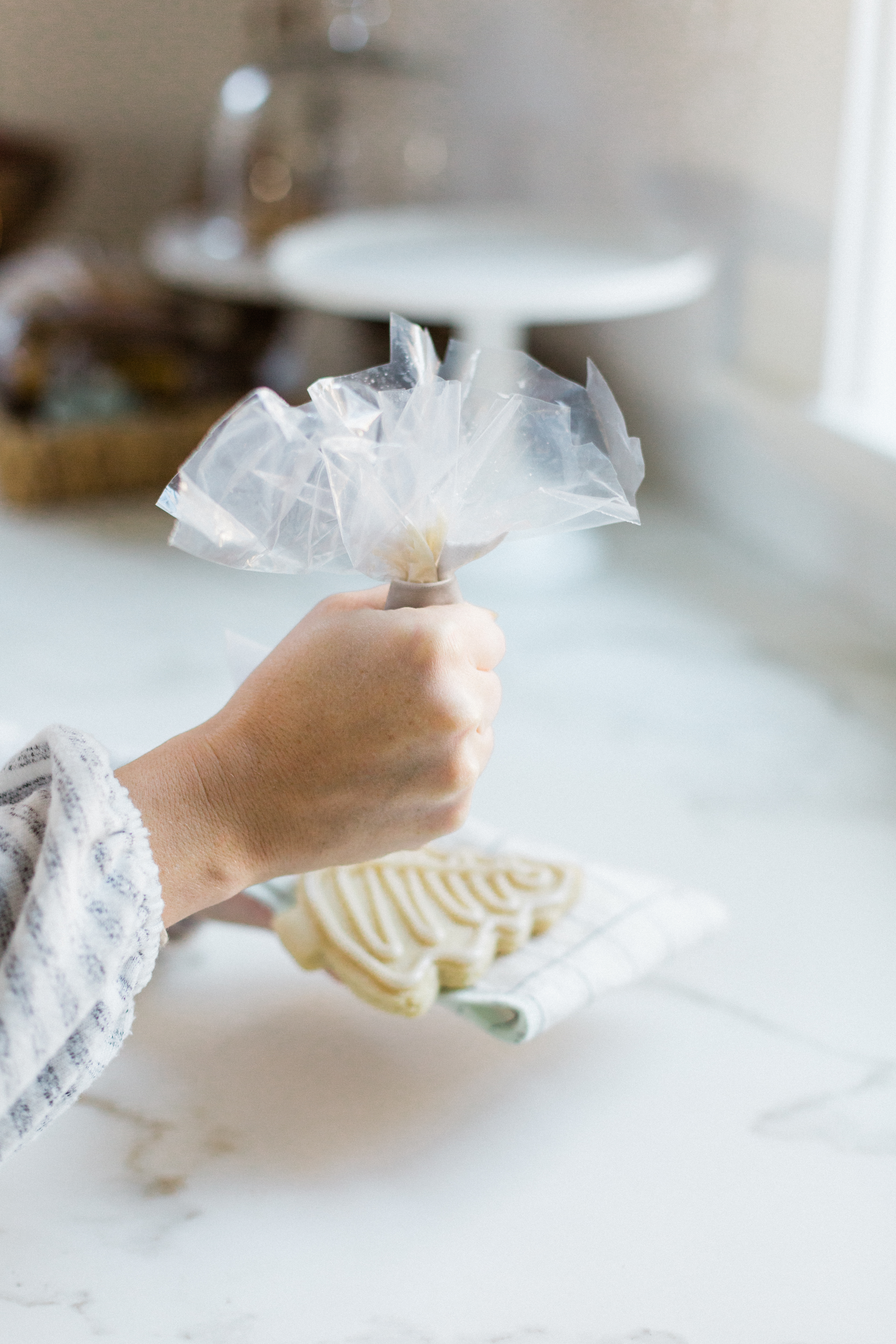 I mixed the frosting ingredients together and then added it to a gallon ziplock baggie. I twisted it close and sniped the end off to make a small opening. The smaller you cut the tip the finer your line of frosting. Because the icing was the right consistency, I smoothed it all together using a toothpick and then it settled into a nice even glaze. I let some harden completely but others I added white sanding sugar to immediately to give it the shine.